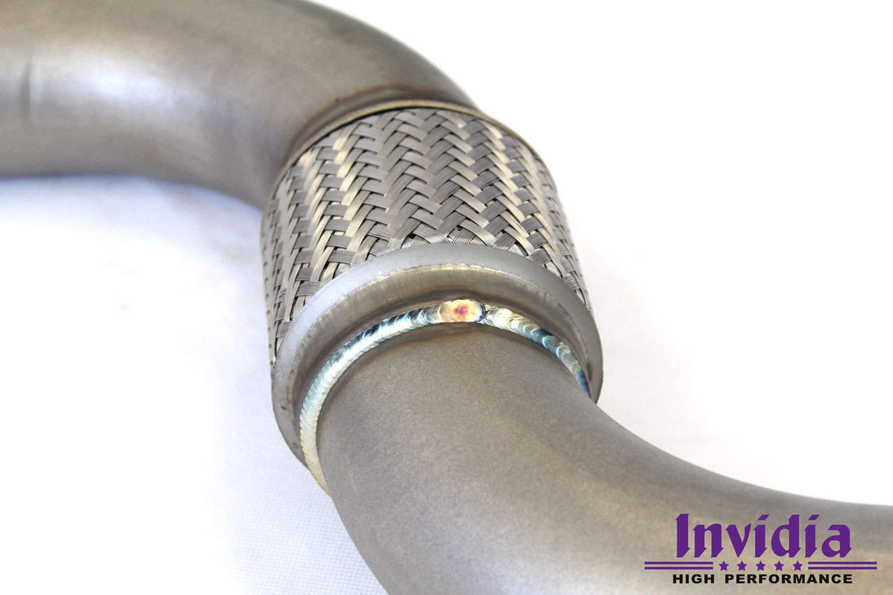 The most restrictive component of the factory exhaust system is the down-pipe which begins right after the turbocharger. Invidia Exhausts use a larger pipe diameter and smooth bends which allows the turbocharger to exhale exhaust gases with fewer restrictions and turbulence. Because of these reasons, Invidia down-pipes make for the most popular exhaust upgrade that adds a substantial bump in both horsepower and torque with a great reduction in turbo lag.