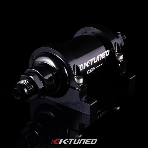A good fuel filter is an important part of any fuel system. They are in place to filter out any potential debris or contaminents before they reach the fuel injectors. K-Tuned High-Flow Fuel Filters are available in 2 different size options that will meet the fuel demands from simple street cars to all out race cars. They are made with 6061 aluminum and suitable for use with alcohol, E85 and all other race fuels. The 2 important features that make this possible are the hard anodized body and the high quality stainless steel mesh filters. The female o-ring ports are easily connected to any size fuel line using standard AN port adapters. Each filter comes with a 100 micron filter but we also have a 30 micron filter available for specific applications where finer filtering is either wanted or necessary. If you are using an aftermarket fuel pump be sure to check the pump manufacturers specs for filter micron ratings. The 8AN size filter measures 1.25″ in diameter and 3.5″ in length . The 10AN size filter measures 2″ in diameter and 5.5″ in length. Note that these overall length measurments do not include the adapters at each end. Port adapters are available separately from K-Tuned. Below is a general HP guide to help you with filter selection. Note that the fuel pump and injectors being used plus the line size need to be taken into account and can increase these potential HP numbers. These are just posted as a basic guideline.