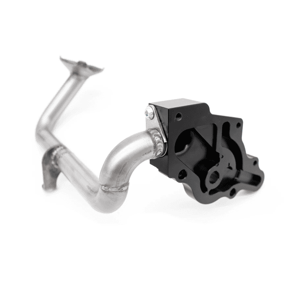 For inside the pan, customers are supplied with an RSX-S oil pump adapter and new pickup tube. These pieces replace half of the factory oil pump, and allow the pickup to be routed over the steering rack. The pump adapter is CNC machined from 6061 aluminum and is anodize hard coated to resist wear inside the pump.