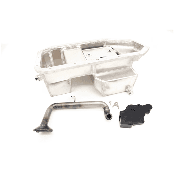 Our oiling system works in conjunction with an OEM K20 oil pump setup (sold separately). A custom 7 quart road race oil pan is supplied that includes baffles, two trap doors, a kickout on the driver side to boost oil capacity, two drain plugs, and an oil overflow plug. The pan is specifically designed to accommodate the Miata steering rack below it.